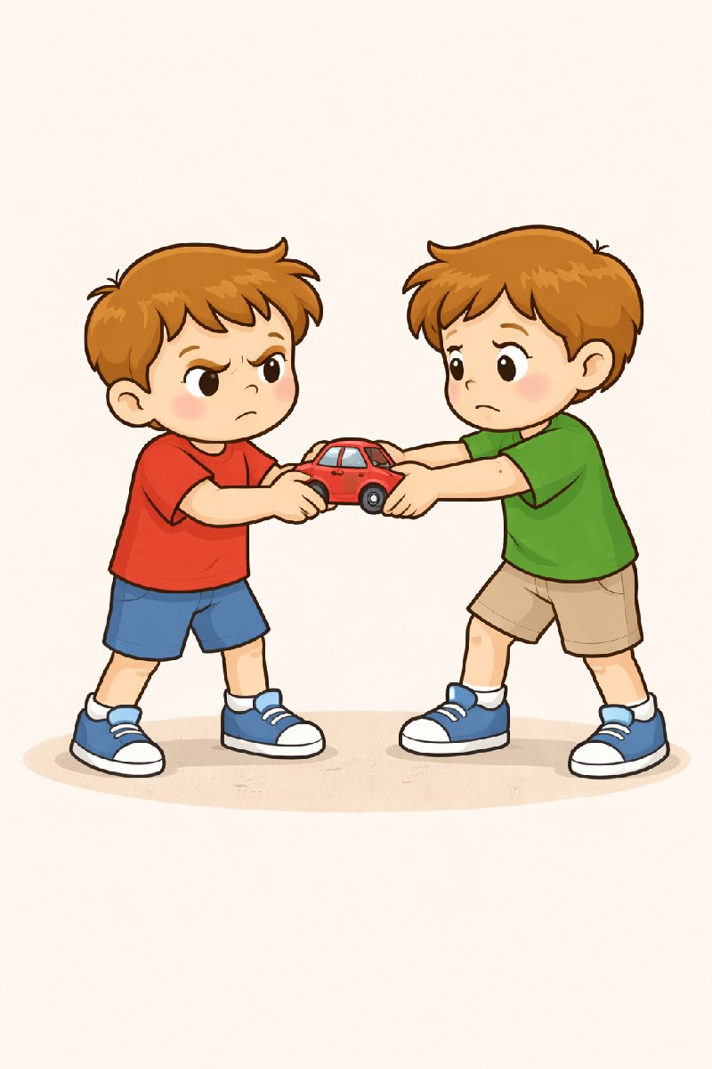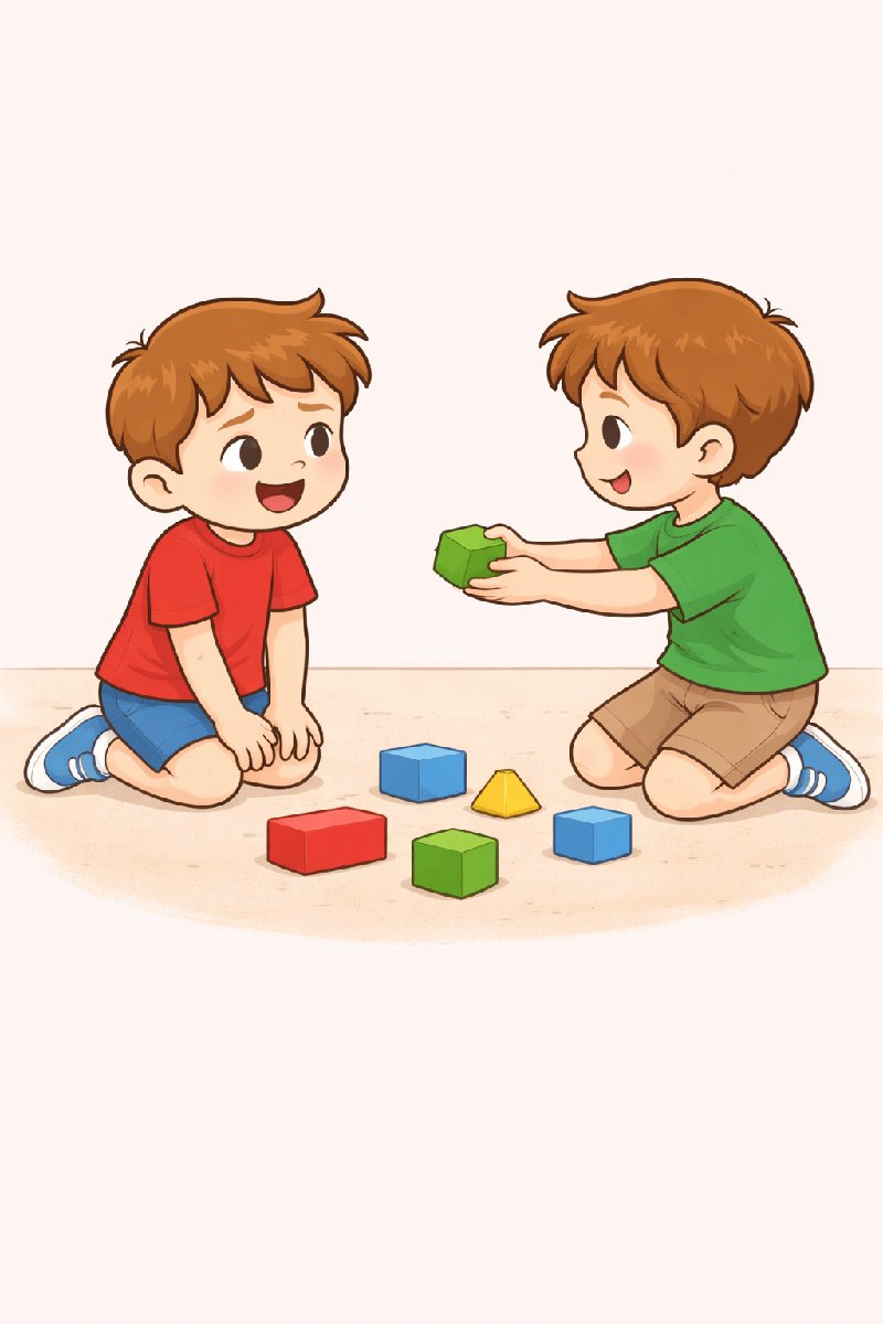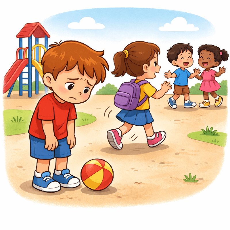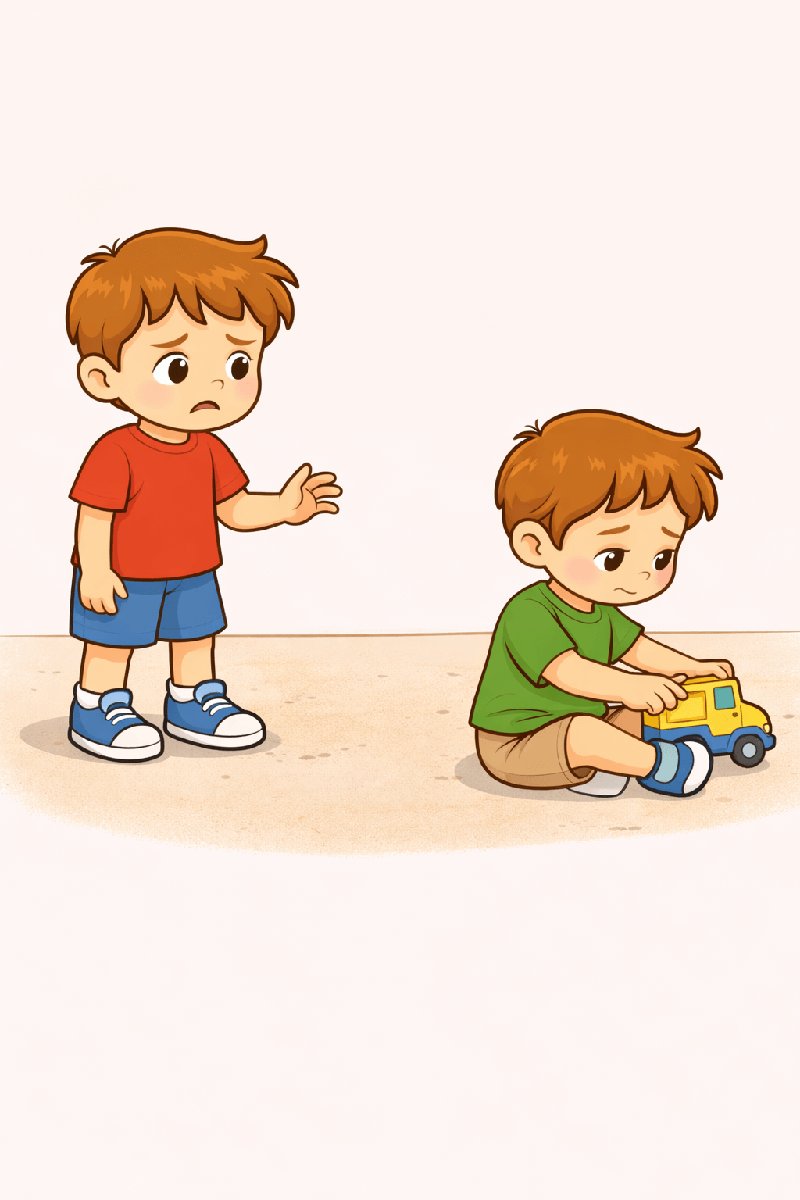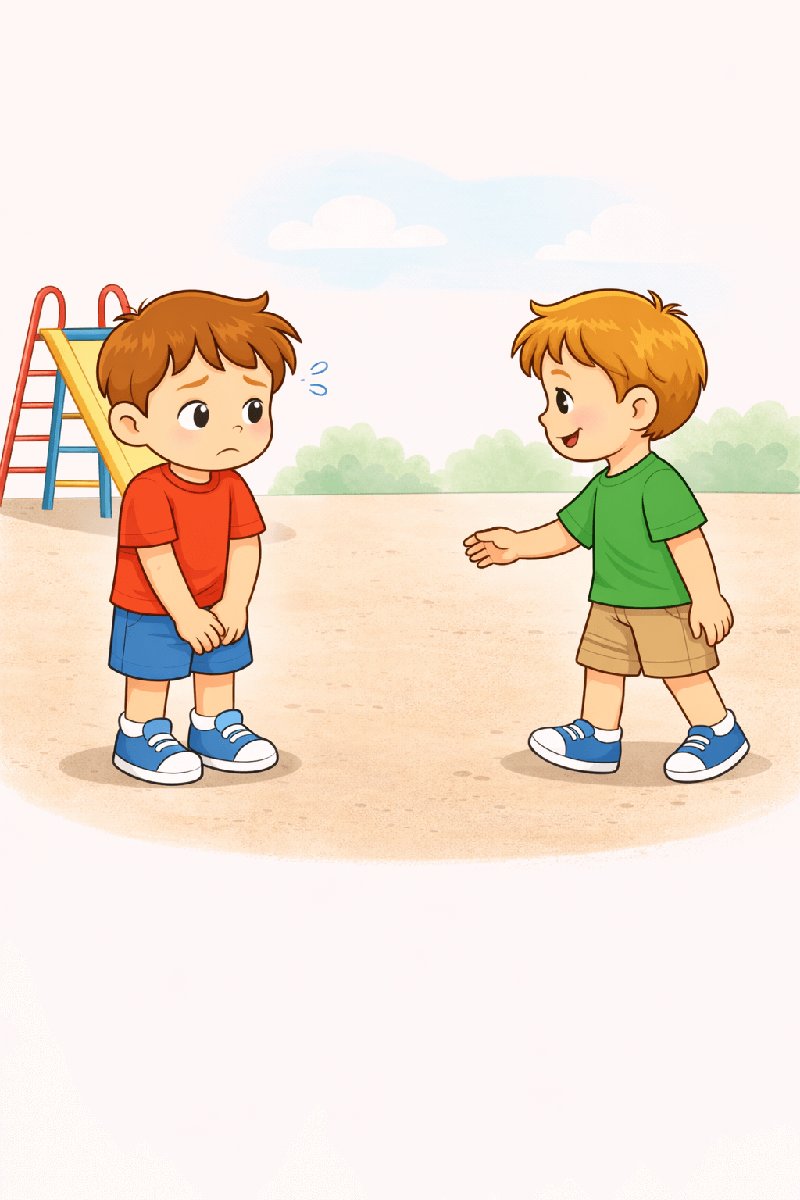"es": "Un niño nuevo se acerca al parque. Tu niño está quieto, juntando las manos, observando.",