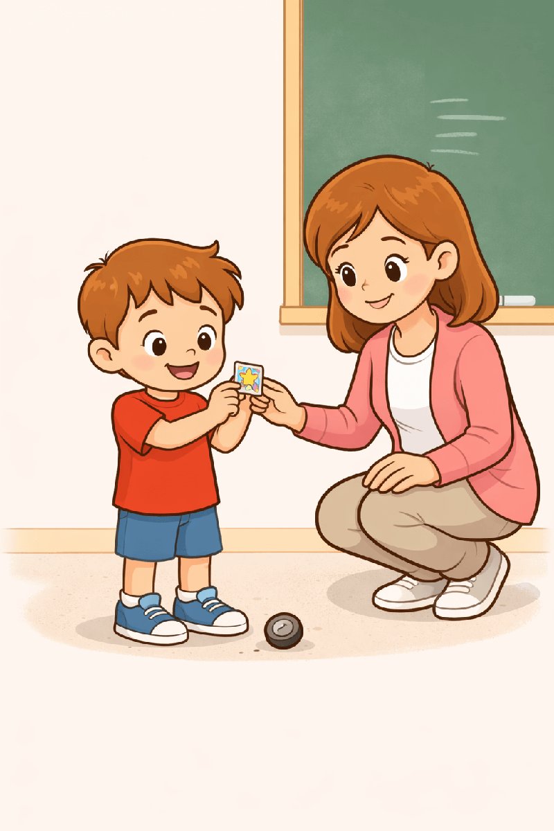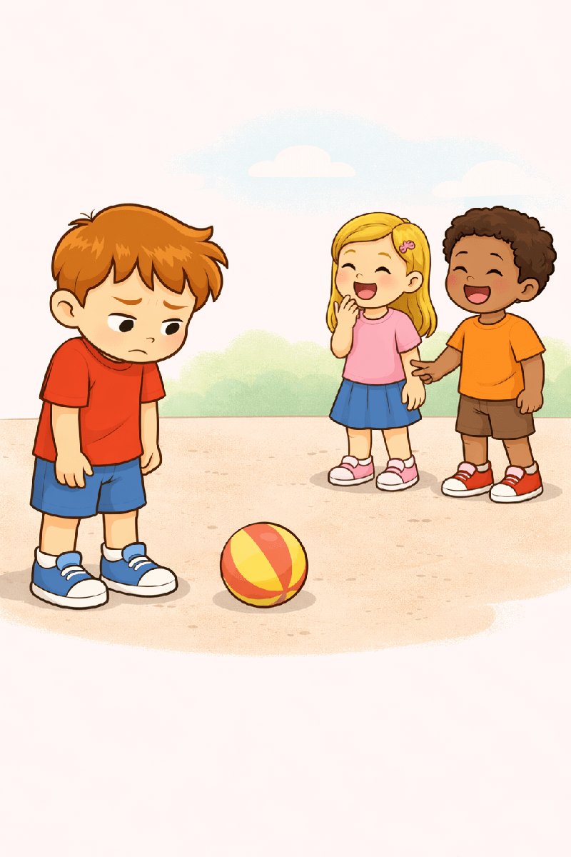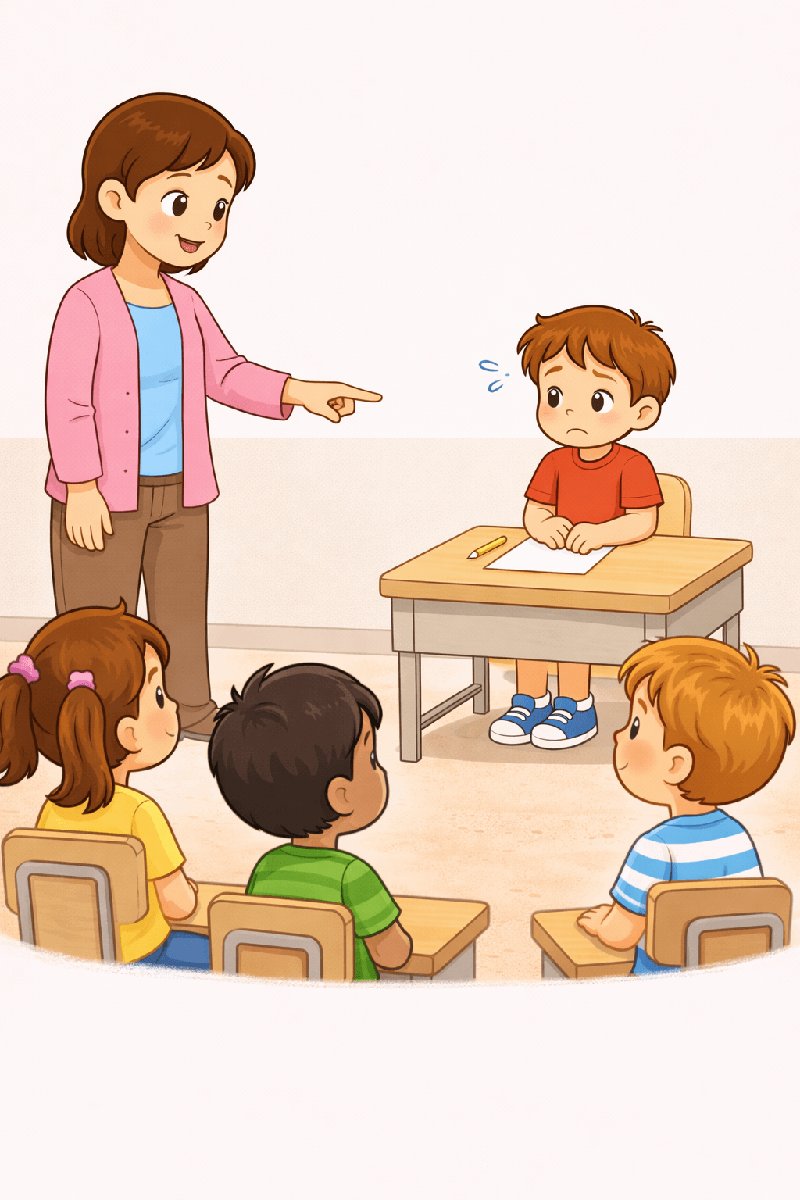 "scene_description": "Classroom. Teacher pointing gently toward him. Other students looking. He looks tense.",