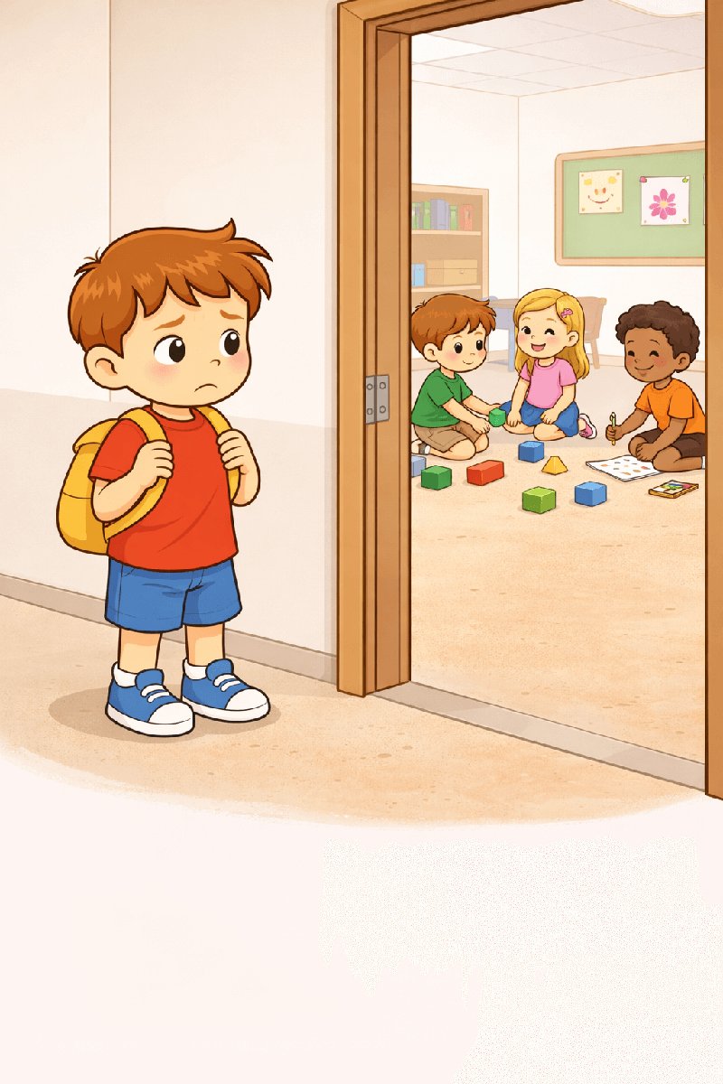 "te": "కొత్త పిల్లవాడు ఆట స్థలానికి చేరుకుంటాడు. మీ పిల్లవాడు చేతులు కలిసి, నిలబడి చూస్తున్నాడు."