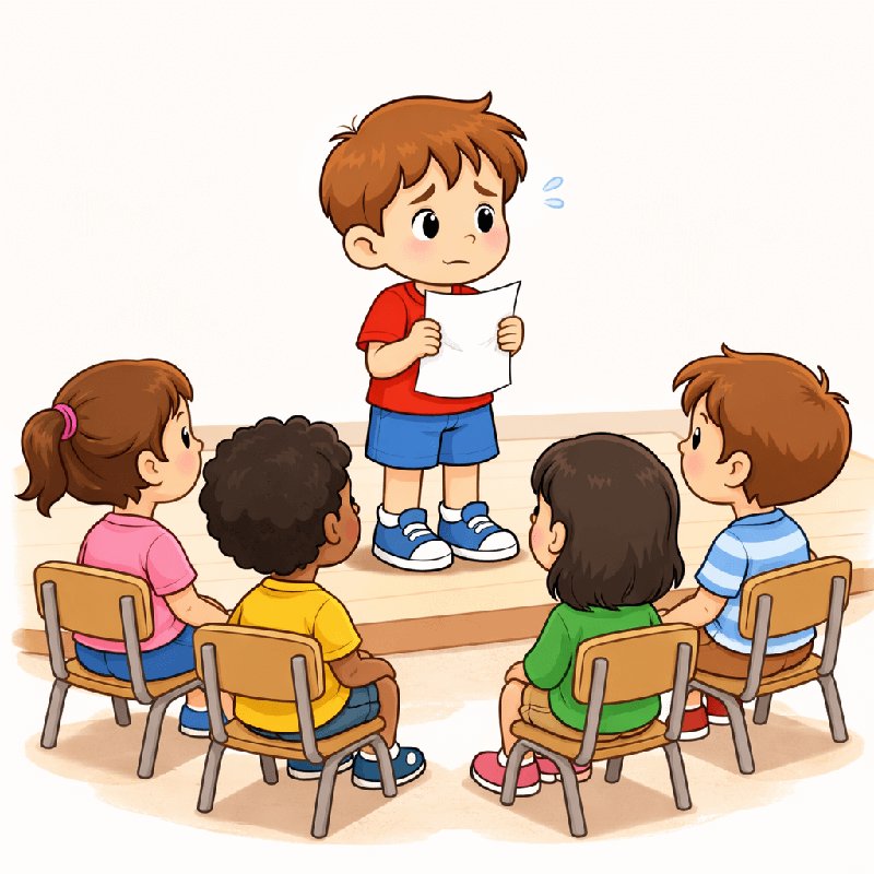 "en": "Yes. Speaking in front of others can make us feel nervous. Nervous is a kind of scared feeling.",
