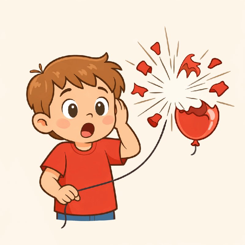 "ar": "طفل يحمل بالونًا. ينفجر البالون بصوت \"فرقعة\". تتحرك يدا الطفل نحو الأذنين.",