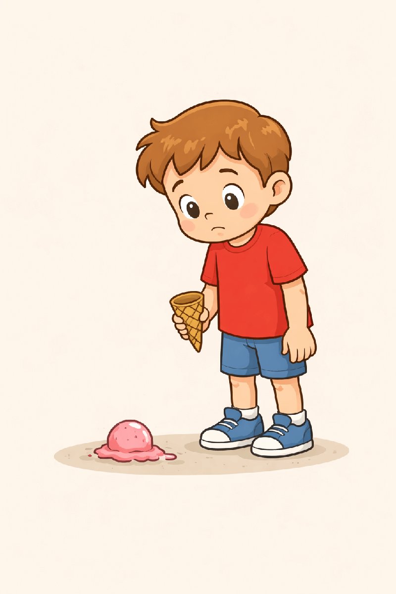 "es": "La bola de helado cae al suelo. El niño la mira hacia abajo.",