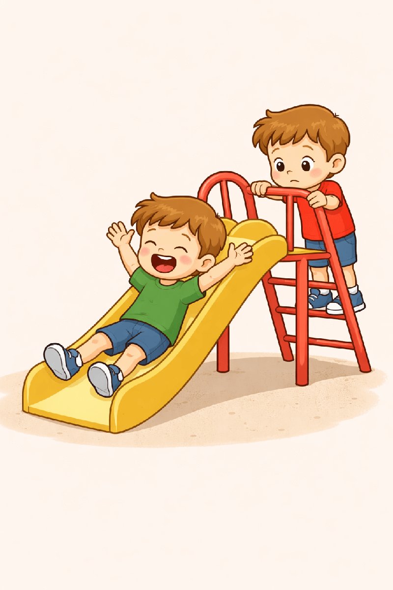 "ar": "الطفل الجديد يقترب من الملعب. طفلك يقف ثابتًا، يضع يديه معًا، يراقب.",