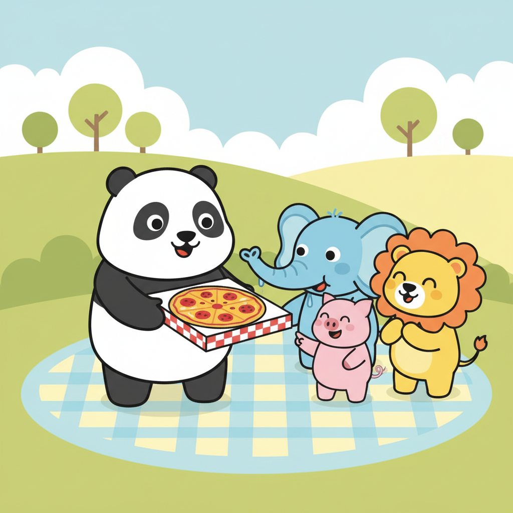 "es": "¡El panda tiene una pizza grande y el elefante tiene hambre!",