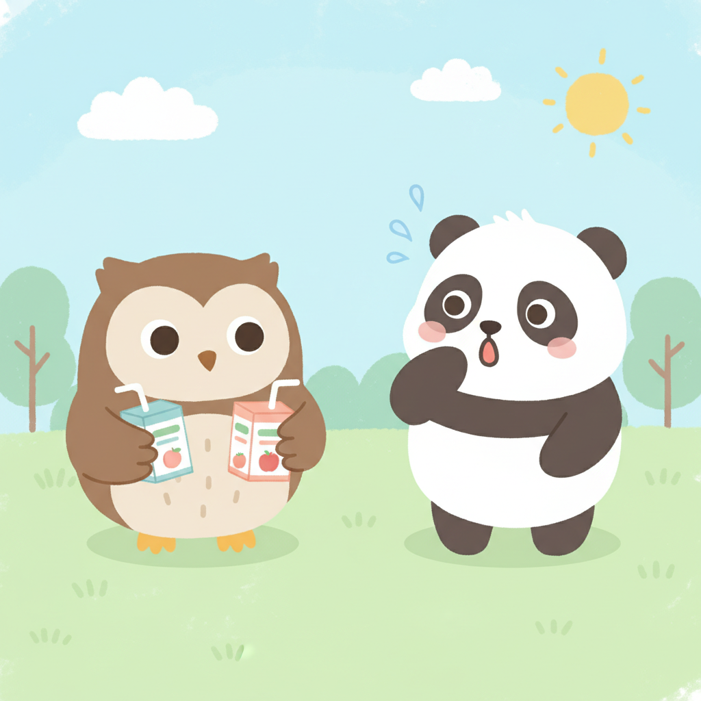 "scenario_text": "The owl has two juice boxes and the panda is thirsty!",