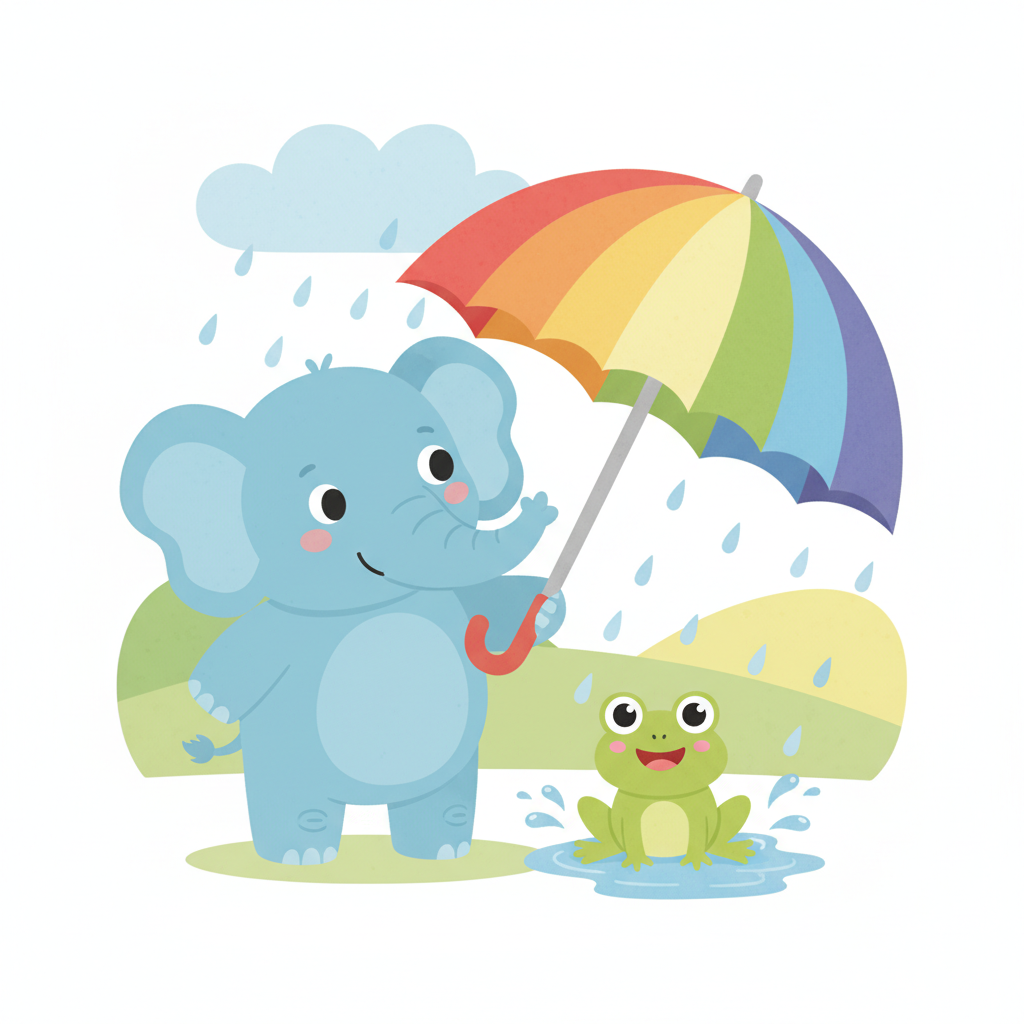"es": "¡El elefante tiene un paraguas grande y la rana se está mojando con la lluvia!",