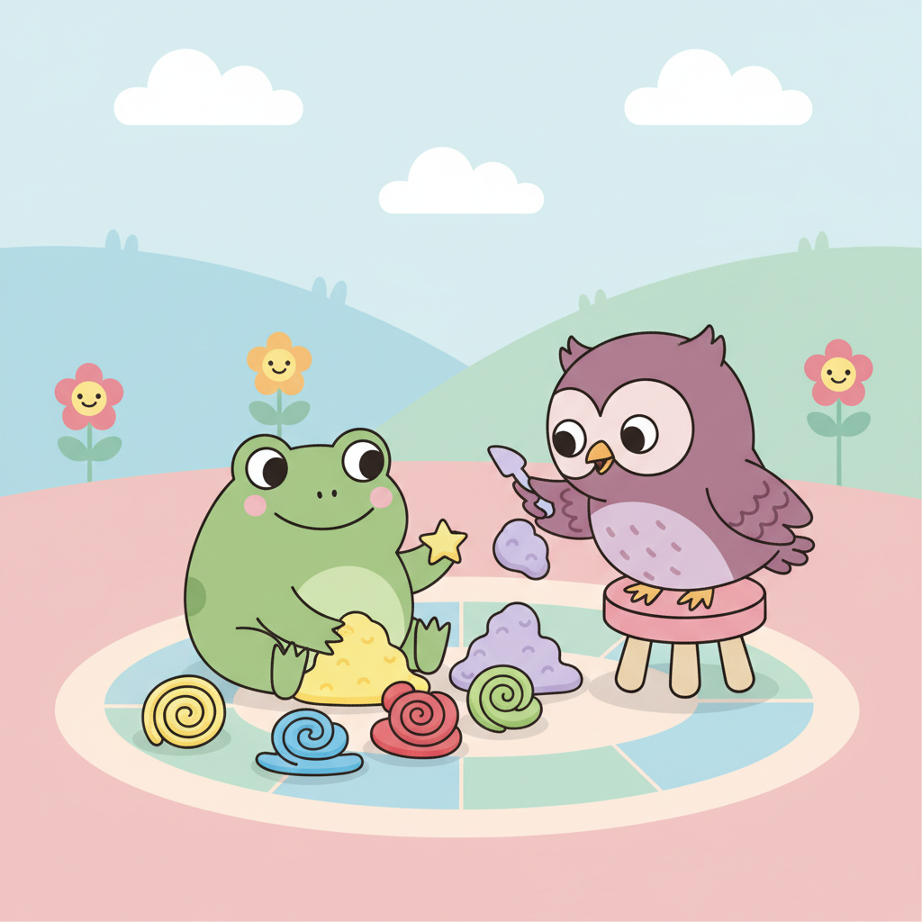 "es": "¡La rana tiene mucha plastilina y el búho también quiere modelar!",