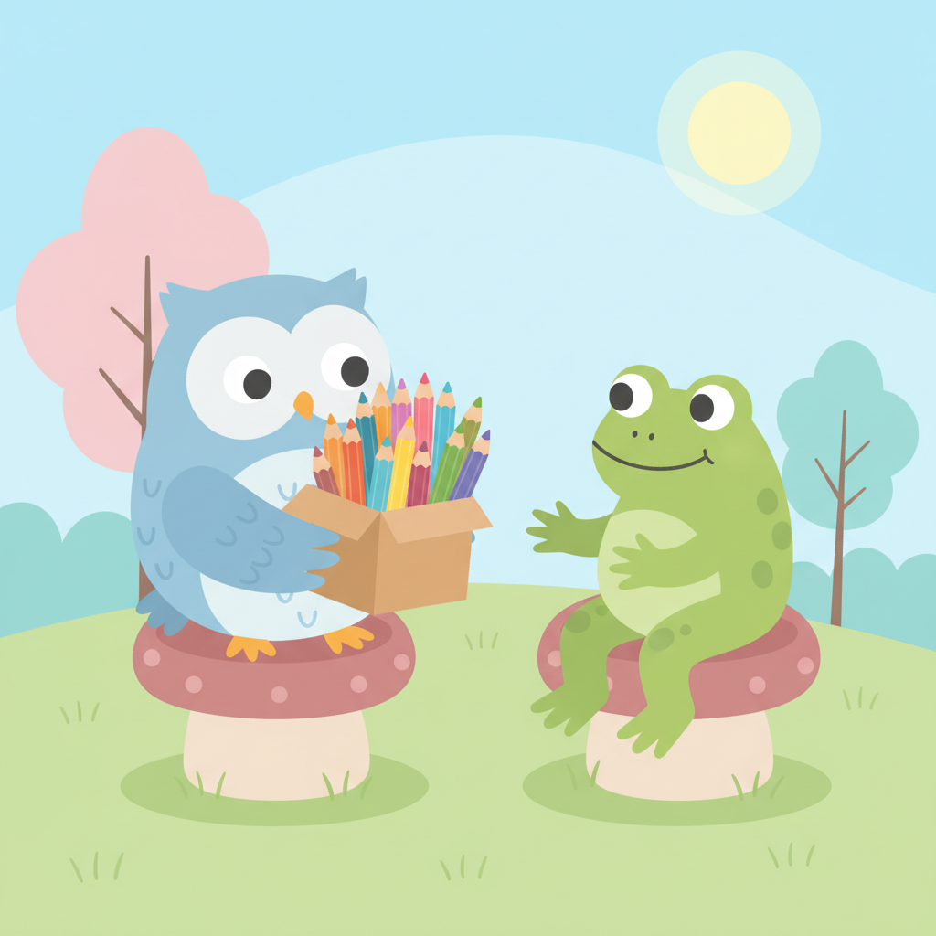 "scenario_text": "The owl has extra coloring pencils and the frog has none!",