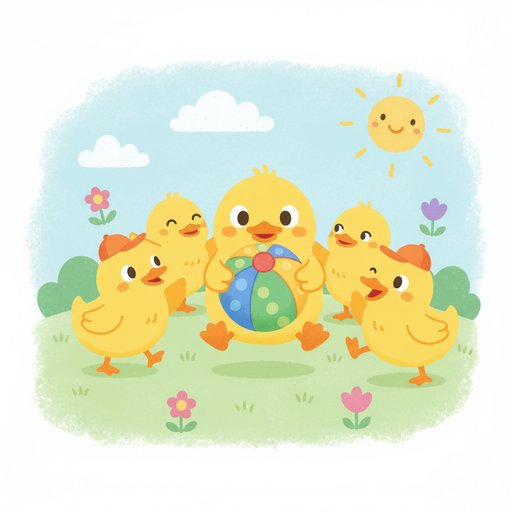 "te": "ఈ బాతుపిల్లకు బంతి దొరికింది, స్నేహితులు ఆడుకోవాలనుకుంటున్నారు!"