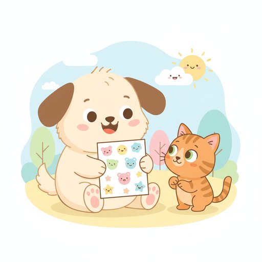 "scenario_text": "This puppy has extra stickers and the kitten wants one!",