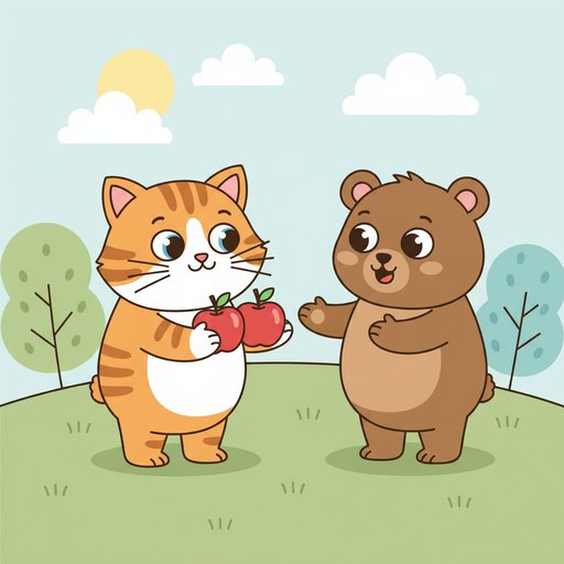 "te": "ఈ పిల్లి పిల్ల దగ్గర రెండు ఆపిల్స్ ఉన్నాయి, ఎలుగుబంటి పిల్ల దగ్గర ఏమీ లేవు!"